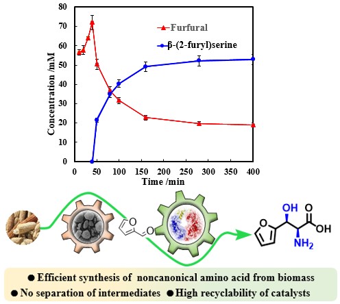 倪晔教授团队提出了一种高效的一锅化学-酶催化合成路径,利用廉价易得的木质纤维素直接转化为呋喃丝氨酸。通过以玉米芯为起始原料,开发了一种新型的磁性固体酸(Fe3O4@MCM-41/SO42–),以及筛选出高活性的L-苏氨酸醛缩酶重组细胞(E.coli PpLTA),构建化学-酶法级联反应体系,实现玉米芯—糠醛—呋喃丝氨酸的多步高效联产转化,最终呋喃丝氨酸产率可达73.6%, ee为99%,de为20%。另外,在一锅反应体系中探索了固体酸和重组细胞催化剂的可回收重复利用性,以提高工艺过程的可持续性和经济性。将化学合成与酶催化相结合,化学-酶级联工艺具有原料可持续性、中间体不分离、效率高、环境友好等优点,具有广泛的应用价值。