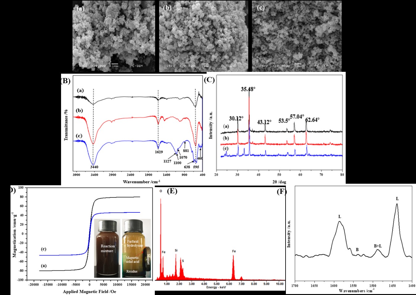 (A): SEM, (B): FT-IR, (C): XRD, (D): VSM, (E): EDAX and (F): PR-IR; (a): Fe3O4, (b): Fe3O4@MCM-41 and (c): Fe3O4@MCM-41/SO42‒