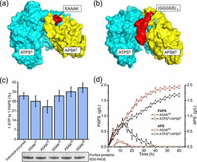 3′-磷酸腺苷-5′-磷酸硫酸(PAPS)是生物体内所有生物磺酸化反应的通用磺酸基团供体。生物制造含磺酸基团化合物 (如肝素和硫酸软骨素)的需求推动了PAPS体外合成的研究。天然PAPS酶法合成面临着转化率低 (2 mol ATP只能合成1 mol PAPS)50%与高成本的障碍。针对现有问题,研究人员开发了一条理论转化率为100%的PAPS合成路线,该路线提供了ATP等摩尔转化为PAPS的条件。