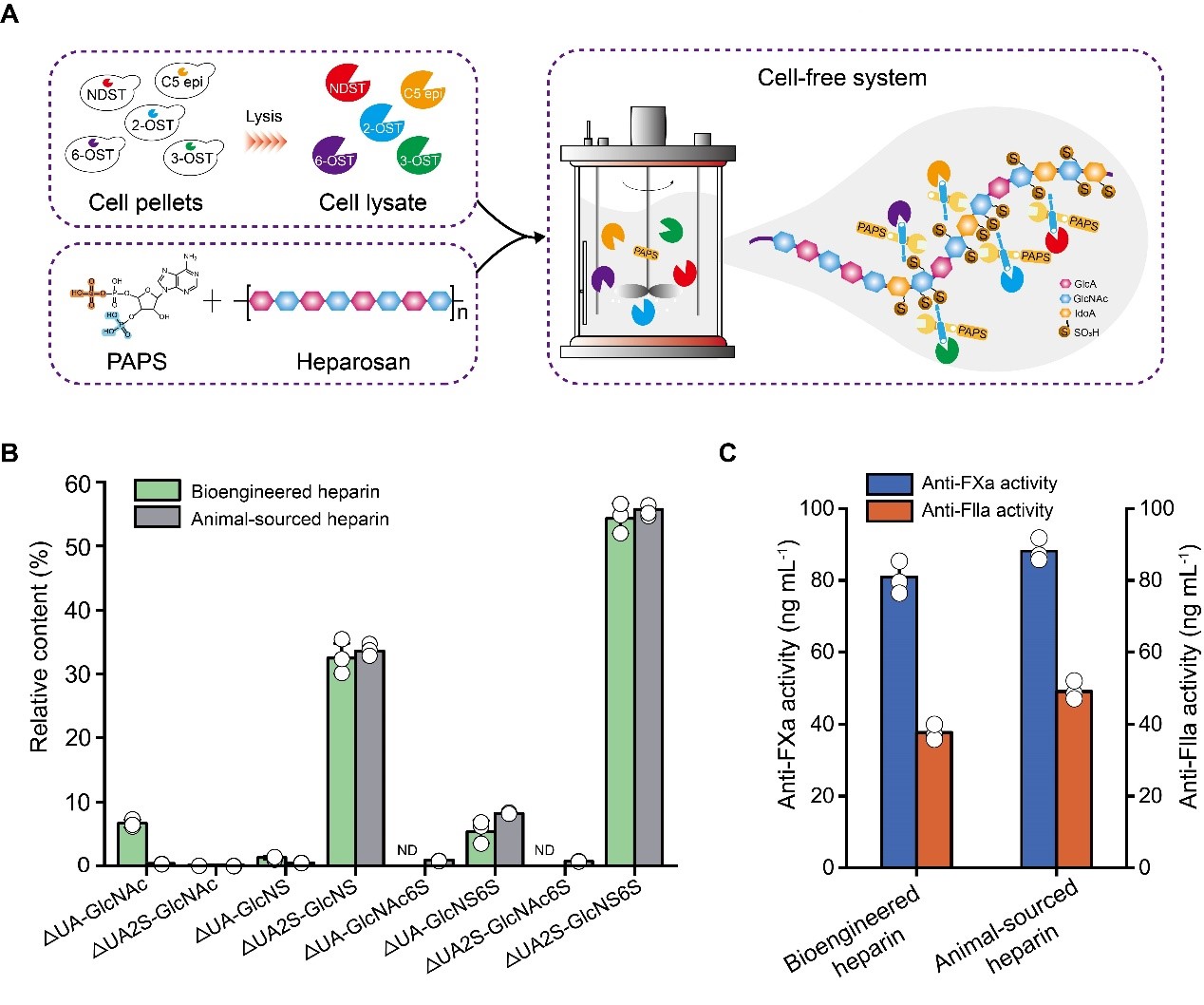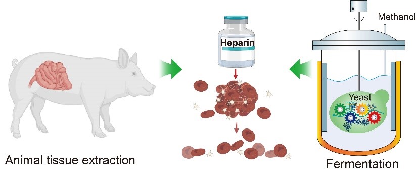 肝素是医学上最广泛的抗凝药物,用于临床血栓、心梗等疾病治疗。目前市场上肝素依赖于猪小肠等动物组织提取。肝素在脊椎动物中发挥着多种作用,如胚胎发育、抗菌/病毒感染(如COVID-19)、抗炎症反应和血液凝固等。动物源肝素中其他糖胺聚糖(如过磺酸化硫酸软骨素)的可变结构和污染加剧了医疗风险,阻碍了其结构-活性关系的研究。目前,已报道的肝素的合成方法有化学法和化学-酶法,但其面临着步骤繁琐或者高成本等障碍。针对现有问题,研究人员开发了一种绿色、简便、易培养的微生物平台合成生物工程肝素,具有与动物源肝素相似的抗凝血活性。