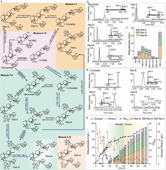 为了进一步验证上述底盘细胞的普适性,本研究基于甜茶苷生产底盘,引入莱鲍迪苷合成途径,成功实现莱鲍迪苷的从头合成。随后,基于Rosette软件对关键限速酶EUGT11进行半理性设计,并通过表达元件改造与动态调控进行代谢流的优化,莱鲍迪苷(RA、RD、RM)在15-L发酵罐中产量达到132.7 mg/L(图5)。总之,本研究通过系统代谢工程策略构建了一株高产甜茶苷和莱鲍迪苷的生产底盘细胞,所采用的研究策略对于其他天然产物合成底盘细胞的构建具有借鉴意义。上述研究得到了国家重点研发项目(2020YFA0908300)、国家自然科学基金(32021005、31930085、31870069)等项目的资助。