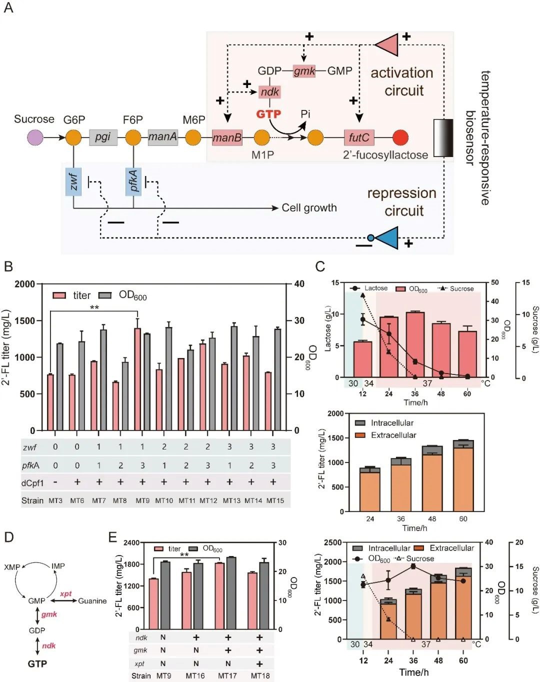 为解决上述难题,该研究在模式工业微生物枯草芽孢杆菌(Bacillus subtilis)中创制了温敏型多模块时序双向调控系统,并将其应用于2'-岩藻糖基乳糖(2'-FL)的代谢网络优化。首先,利用大肠杆菌噬菌体中温敏型转录因子突变体CI857的调控机制,设计并创制了多个不同激活点(30、32、34与37℃)的温敏型生物传感器(图1)。其次,将多个不同激活点的温敏型生物传感器进行联用,构建了一种可以对多代谢模块进行时序激活调控的单输入多输出(SIMO)基因回路,并对该基因回路的正交性与功能性进行了验证(图2)。随后,将温敏型生物传感器与基于CRISPRi的逻辑“非”门进行耦合,构建了一种可以对不同代谢模块进行激活与抑制的双功能基因回路,并对该基因回路进行了功能验证(图3)。
