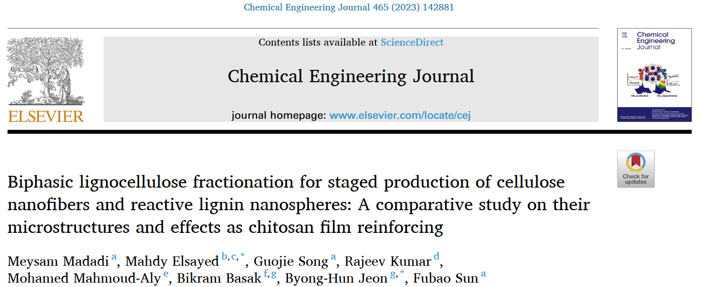 近期,Beat365官网Beat365官方网站孙付保教授研究团队在利用木质纤维素生物质转化为绿色纳米材料方面取得重要进展,研究成果“Biphasic lignocellulose fractionation for staged production of cellulose nanofibers and reactive lignin nanospheres: A comparative study on their microstructures and effects as chitosan film reinforcing”正式发表于Chemical Engineering Journal (一区, Top, IF=16.7)(https://doi.org/10.1016/j.cej.2023.142881)