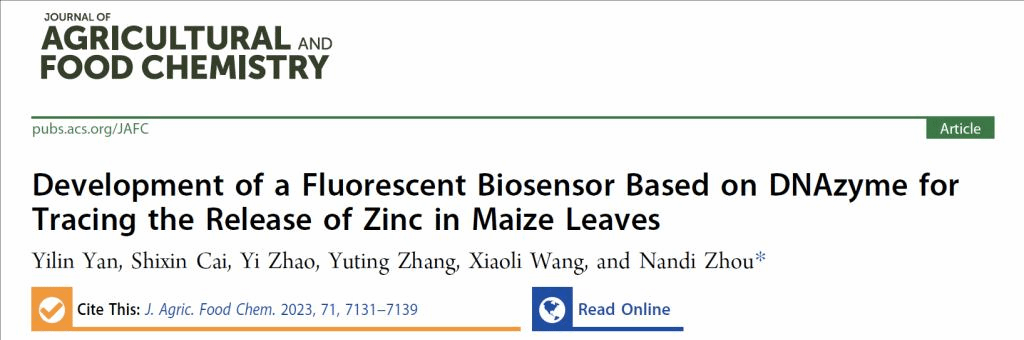 近期,Beat365官网Beat365官方网站周楠迪教授团队在荧光生物传感器方面取得重要进展,研究成果“Development of a fluorescent biosensor based on DNAzyme for tracing the release of zinc in maize leaves”正式发表于Journal of Agricultural and Food Chemistry (IF =/info/1021/ /5.895) (https://pubs.acs.org/doi/10.1021/acs.jafc.3c00508)。