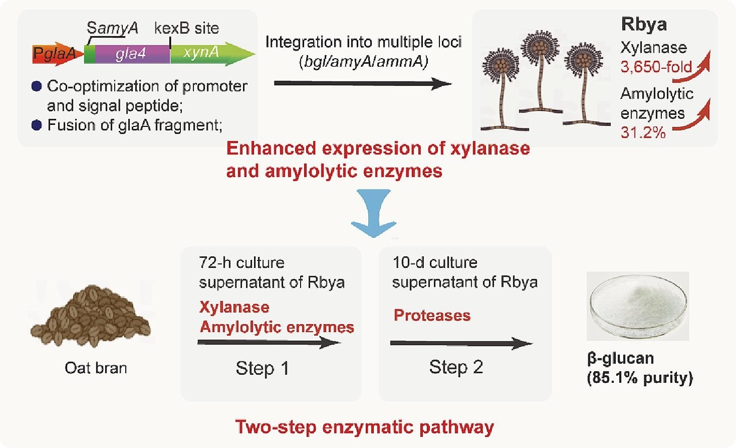 针对上述问题,本研究团队利用过量表达内源性木聚糖酶(xynA)和淀粉水解酶的黑曲霉(Aspergillus niger)AG11重组菌株,通过两步酶法从燕麦麸中提取β-葡聚糖。首先,在β-葡萄糖苷酶(bgl)基因座上,通过启动子和信号肽的共同优化以及糖化酶(glaA)片段的融合来提高xynA和淀粉水解酶的表达。随后,通过CRISPR-介导的同源定向修复(CRISPR/HDR)系统,将优化的表达框同时整合到bgl、α-淀粉酶(amyA)和酸性α-淀粉酶(amyA)基因座上,得到的重组菌Rbya的xynA和淀粉水解酶活性分别比野生型菌株增加3650倍和31.2%。最后,Rbya发酵72小时(富含xynA和淀粉水解酶)和10天(富含蛋白酶)的上清液被分别用于分解燕麦麸中的木聚糖/淀粉和蛋白质,获得85.1%纯度的β-葡聚糖。本研究构建的高表达木聚糖酶、淀粉水解酶和蛋白酶的A. niger重组菌株在低成本提取β-葡聚糖的工业化应用中具有潜力。