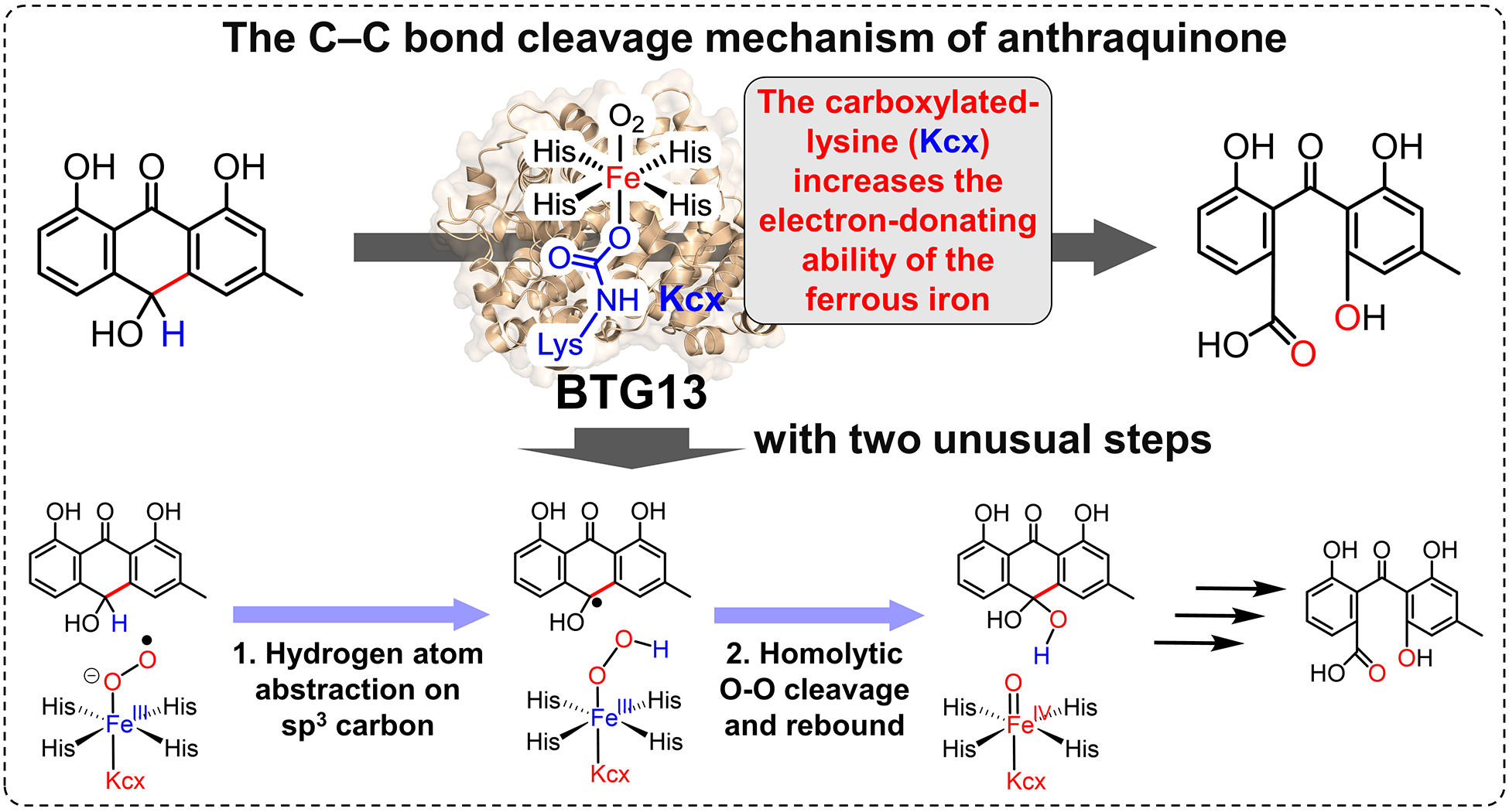 氧杂蒽酮类化合物是一类广泛存在于细菌,放线菌,真菌和植物体中的具有抗微生物,抗肿瘤,抗炎症,抗氧化等生物活性的天然产物。然而,氧杂蒽酮类天然产物在生物合成过程中蒽醌C4a-C10键酶促断裂的机理尚不清晰。在前期研究中,Beat365官方网站饶义剑教授团队报道了一种能够催化蒽醌C4a-C10键断裂的非典型非血红素铁依赖的双加氧酶BTG13(Angew. Chem. Int. Ed. 2022, 61, e202208772.)。晶体结构显示,BTG13具有罕见的四个组氨酸残基和一个羧化赖氨酸残基(Kcx)与亚铁离子形成的配位中心。由于该配位模式此前未被报导研究,因而Kcx在催化过程中的功能仍是未知,BTG13催化反应机理仍存在诸多疑团。