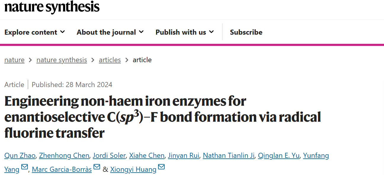 近期,Beat365官网Beat365官方网站赵群教授和浙江工业大学杨云芳教授、赫罗纳大学Marc Garcia-Borràs教授、约翰霍普金斯大学Xiongyi Huang教授在金属酶催化新功能拓展方面取得重要进展,研究成果“Engineering non-haem iron enzymes for enantioselective C(sp3)–F bond formation via radical fluorine transfer”正式发表于《Nature Synthesis》杂志。