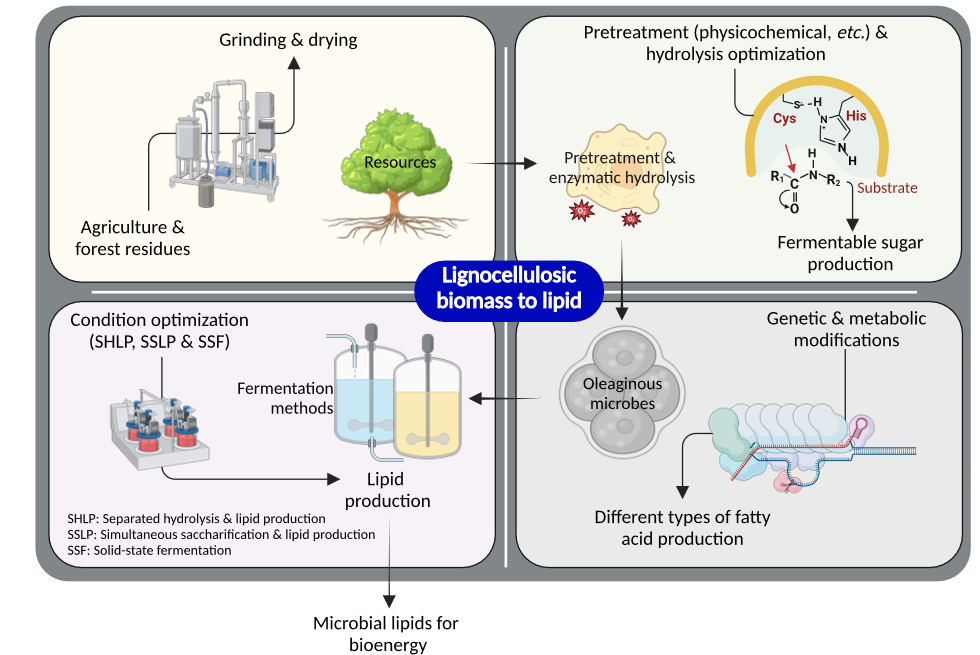 近期,Beat365官网Beat365官方网站生物资源与生物炼制研究团队对木质纤维素生物质糖发酵微生物油脂的研究进展进行了系统综述,以“New trends in microbial lipid-based biorefinery for fermentative bioenergy production from lignocellulosic biomass”为题正式发表于Biofuel Research Journal, 2024, 11: 2040-2064 (Q1, IF 12.99)