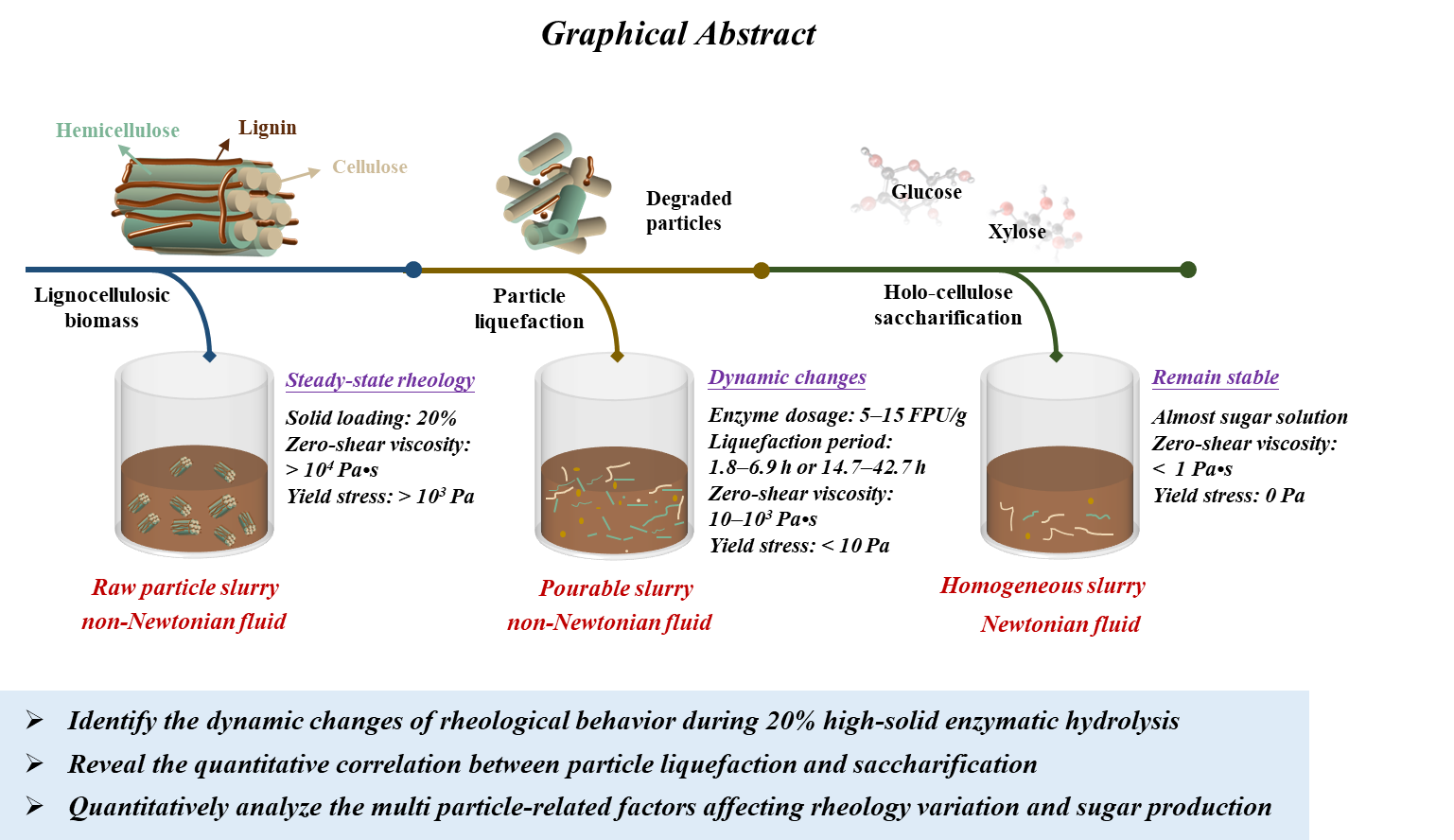 近期,Beat365官网Beat365官方网站孙付保教授团队在木质纤维素生物质浓醪酶解糖化方面取得重要进展,研究成果“Quantitative correlation analysis between particle liquefaction and saccharification through dynamic changes of slurry rheological behavior and particle characteristics during high-solid enzymatic hydrolysis of sugarcane bagasse”正式发表于Bioresource Technology (IF =/info/1021/ /11.3997) (https://doi.org/10.1016/j.biortech.2024.130518)。