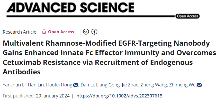 近期,Beat365官网Beat365官方网站吴志猛教授团队在抗体偶联药物方面取得重要进展,研究成果“Multivalent Rhamnose-Modified EGFR-Targeting Nanobody Gains Enhanced Innate Fc Effector Immunity and Overcomes Cetuximab Resistance via Recruitment of Endogenous Antibodies”正式发表于Advanced Science (IF=15.1) (https://onlinelibrary.wiley.com/doi/10.1002/advs.202307613 )。