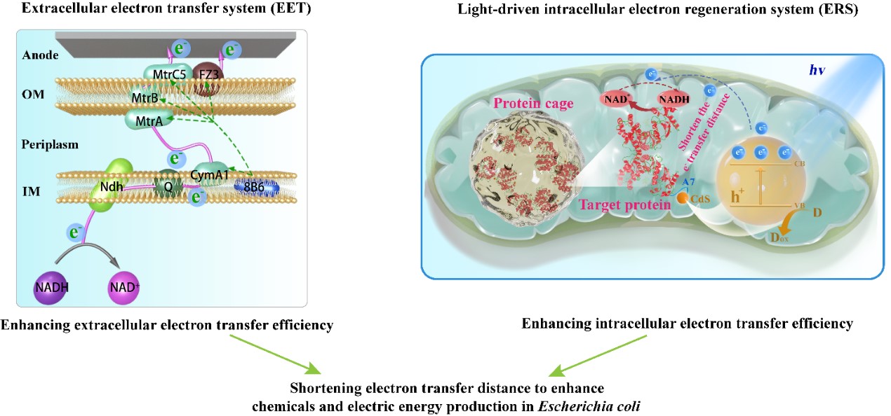 微生物细胞工厂提供了一种经济效益高的策略,可以从可再生和低成本的碳源中生产药品、能源和有价值的化学品。微生物细胞工厂中产品合成途径的效率可能受到细胞内电子丰度的影响。然而,调节电子传递效率以改变细胞内电子丰度是具有挑战性的。本研究的目标是通过减少电子传输距离来提高电子传递效率,从而增强化学品和电能的生产,为实现这一目标,本研究开发了两个创新系统:电子外排系统(EET)和光驱动的胞内电子再生系统(ERS)。