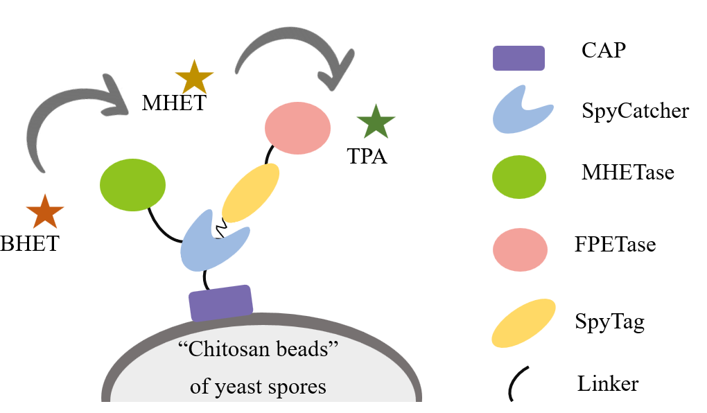 在饥饿条件下,酿酒酵母二倍体细胞进行减数分裂,产生四个单倍体休眠细胞-孢子。孢子壁由四层结构构成,从内到外依次为甘露聚糖、β-葡聚糖、壳聚糖和二酪氨酸。当参与组装孢子壁最外层二酪氨酸的DIT1基因被敲除后,酵母孢子壁的壳聚糖层会暴露在最外面,形成天然的孢子“壳聚糖球”。在前期研究中建立了一种新型的基于壳聚糖亲和蛋白的孢子表面展示系统。本研究在此基础上,构建了酵母孢子“壳聚糖球”表面双酶自组装共展示体系,并应用于塑料聚对苯二甲酸乙二醇酯PET水解酶的自组装共展示。