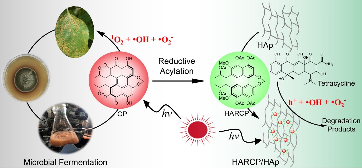 饶义剑教授团队基于前期挖掘天然产物尾孢菌素(CP)的优异光敏活性,通过发酵工程技术大量制备尾孢菌素(Microbial Cell Factories, 2021,Accepted),并把它应用于仿生应用于光催化领域(Journal of Catalysis, 2021, Accepted;Green Chemistry, 2019 (21), 6073-6081;Journal of Catalysis, 2019, 380, 1-8)之外,把它原创性拓展应用于环境修改领域,即光降解水中污染物四环素。首先,筛选了不同种类的商业可得的负载材料,结合实验数据选取羟基磷灰石(HAp)作为负载材料。其次,通过对不同尺寸的蜘蛛状“手臂”进行结构改造,其中,带有6个“乙酰化手臂”的HARCP不仅增强了其光敏性,而且可以紧密吸附在HAp材料上,即使经过多次循环实验也不会泄漏。在温和条件下制备的HARCP/HAp复合材料具有很高的TC光降解活性,在10 min可基本完全降解四环素;同时该材料也具有良好的可重复使用性和稳定性,重复使用3次后催化剂性质与催化效果仍无明显变化。最后,这种新型光催化体系可以有效地去除在自然光照下实际浓度为158 μg/L的5 L溶液。本研究将自然产物的衍生物巧妙地结合到污染物降解领域,为进一步扩大天然产物的应用提供了另一种途径。