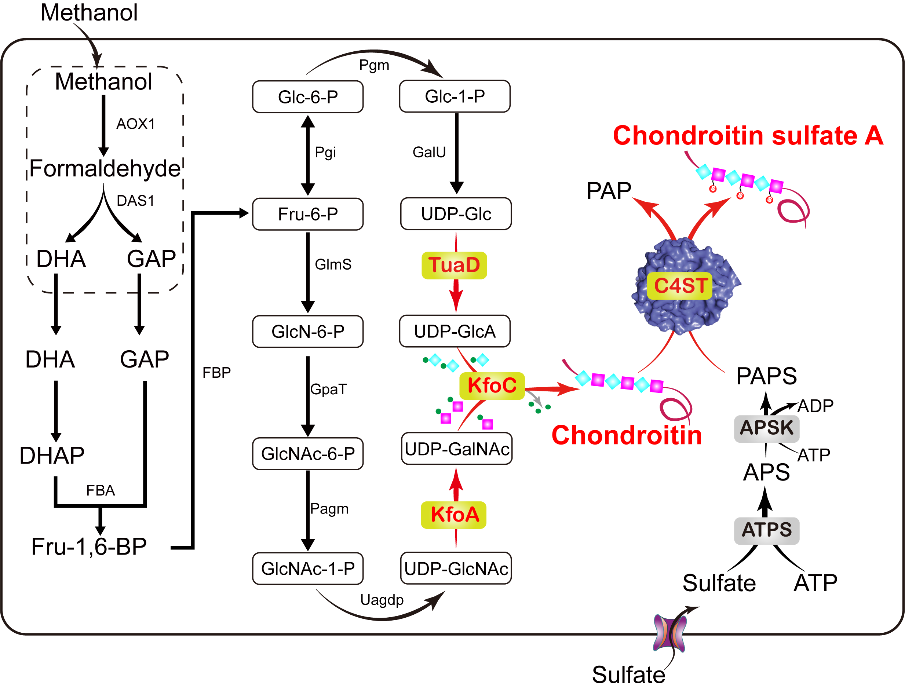 硫酸软骨素(Chondroitin sulfate, CS)是一种广泛分布在软骨组织中的线性糖胺聚糖,由葡萄糖醛酸(GlcA)和N-乙酰半乳糖胺(GalNAc)通过β(1→3)和β(1→4)糖苷键交替连接并经过一定磺酸化修饰而成。CS广泛应用于临床、医疗和营养保健等领域。然而,当前所有商业化的CS都是来自动物组织提取,这种生产模式存在许多问题,例如动物饲养周长、抗生素的使用、动物排泄物的污染、使用高温及酸碱提取以及产品存在潜在的致病因子等。