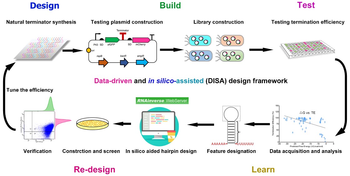 本研究基于 “设计-构建-测试-学习”(DBTL)的思想,通过建立并分析SAR数据集,抽提出与终止子功能相关的重要参数,借助生物信息学软件进行从头设计。利用该方法获得的终止子有别于天然终止子序列,作用过程能最大程度避免不同底盘遗传系统的影响,体现出更好的正交性。该研究思路也能为其他生物元件的设计提供参考和借鉴。