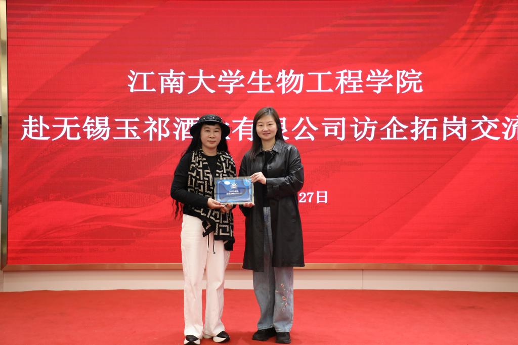 座谈交流环节,无锡玉祁酒业有限公司董事长顾春燕对来访师生表示欢迎。她还介绍了公司的发展情况、人才政策、营销理念,期待校企双方能进一步深化合作,为酿酒行业的人才培养和产业发展作出贡献。林丹表示,玉祁酒业是一家知名的“中华老字号”品牌,也是Beat365官方网站理事单位,校企双方渊源深厚。本次访企拓岗交流活动,旨在推进求职学生与玉祁酒业的“双向奔赴”。公司包装车间主任张捍东、生产经理高翔、质量部长刘翠,仓库主任沈伟燕一同参加了座谈,并与同学们关心的玉祁酒工艺特点、行业发展情况、公司员工发展路径等进行了深入交流。会后,林丹还向顾春燕授牌“大学生就业最佳战略合作伙伴”。
