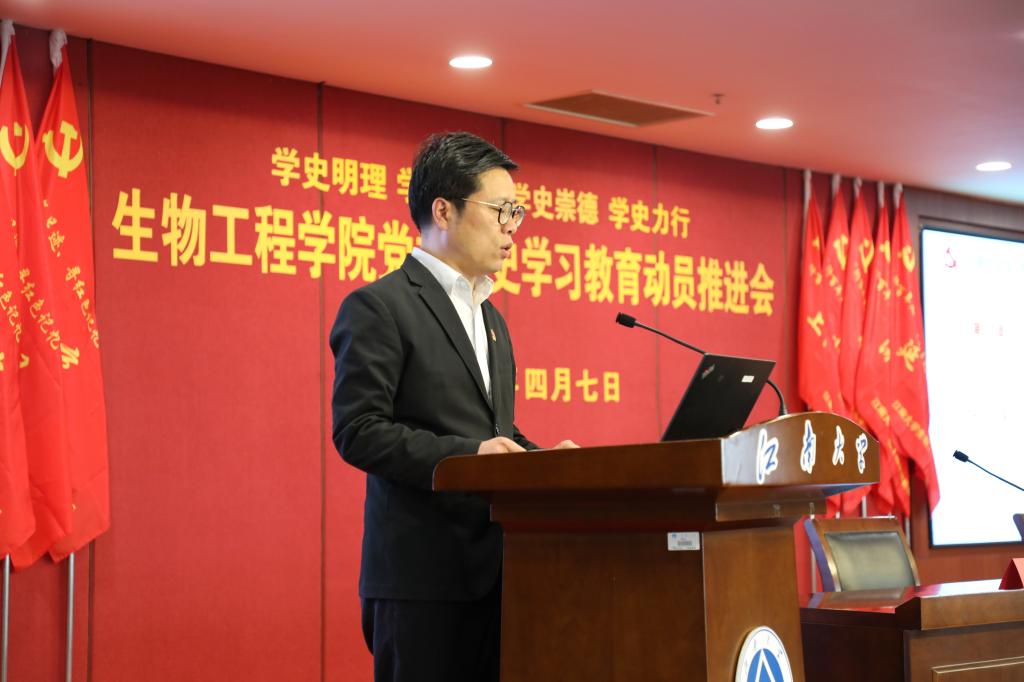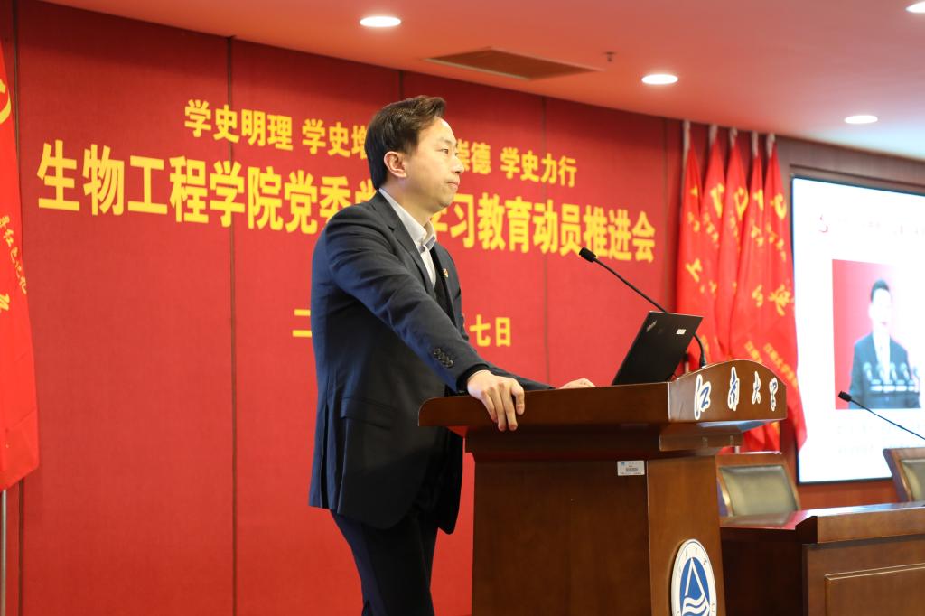 4月7日下午,Beat365官方网站党委党史学习教育动员推进会在图书馆五楼报告厅举行。会议认真学习贯彻习近平总书记在党史学习教育动员大会上的重要讲话精神,落实上级决策要求,对学院党委党史学习教育进行全面动员部署。Beat365官方网站党委书记王维、院长许正宏,院党委委员、粮食发酵工艺与技术国家工程实验室常务副主任李兆丰,院党委副书记周云龙、副院长陈献忠出席会议。师生党支部全体委员、党员代表,以及经开区太湖国际社区党委嘉宾参加活动。会议由学院党委专职组织员胡博主持。